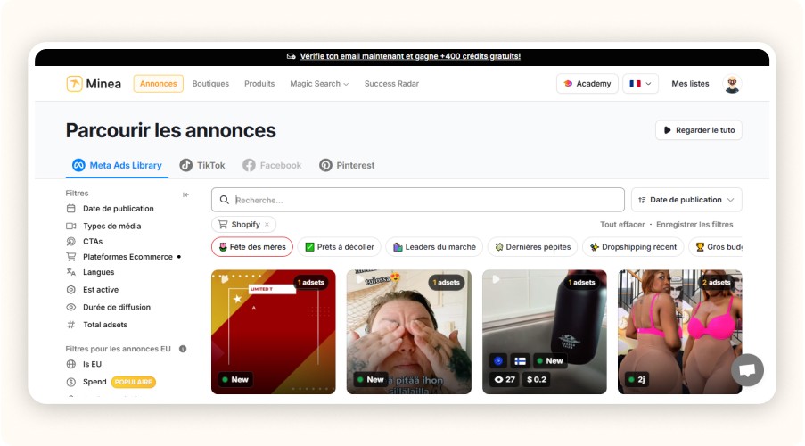 Vous pouvez tester Minea gratuitement et accéder dès aujourd’hui à une sélection de publicités TikTok à fort potentiel. Une vraie opportunité pour prendre une longueur d’avance sur la concurrence.