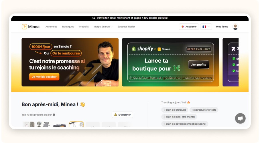 Minea n’est pas seulement un outil d’analyse publicitaire. C’est aussi une véritable plateforme de recherche produit et d’analyse marketing. Grâce à son intelligence artificielle, elle passe en revue des millions de publicités diffusées sur TikTok, Facebook et Pinterest, pour en extraire les tendances les plus prometteuses.